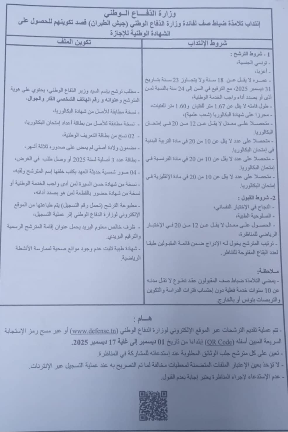 ويكون التسجيل عبر الموقع الإلكتروني للوزارة www.defense.tn أو عبر مسح رمز الاستجابة السريعة QR Code، وذلك غلى غاية 17 ديسمبر.